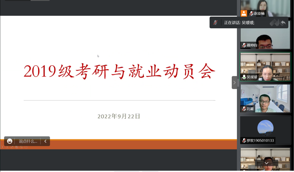 为帮助2023届本科毕业生对报考院校、专业做出合理选择,引导学生全面提升就业意识,树立合理就业期望,增强就业竞争力,9月22日下午,法学院以腾讯会议的形式召开2023届毕业生考研指导暨就业动员大会。法学院党委副书记吴瑷瑷,副院长刘夏,青年教师聂帅钧、许晏铭及法学院2023届全体本科毕业生参加会议,会议由法学院2019级辅导员赵亚楠主持。