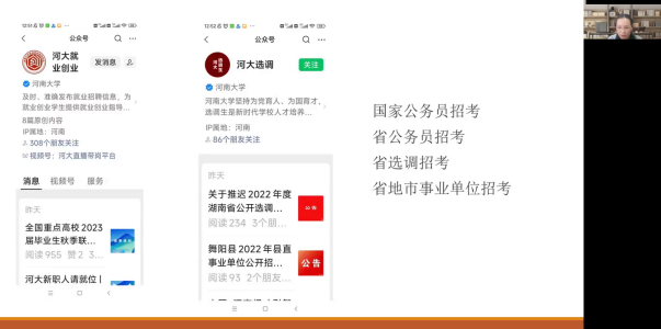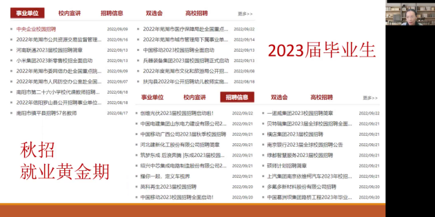 随后,吴瑷瑷结合学院2018级本科生考研情况及全国大学生考研情况的相关数据进行了对比分析,建议同学们从“理性看待考研”“合理确定目标”“全力以赴备考”三方面着手,提高一战成功率。“考研的终极目标还是为了工作,同学们应结合自身发展目标,理性确定努力能够实现的目标,争取一次上岸。既然确定了目标与方向,就风雨兼程,全力以赴。”最后,吴瑷瑷建议同学们抓住“秋招”这个就业黄金期,备考的同时积极关注“幻影app官方版下载就业创业信息网”“河大就业创业”“河大选调”等平台发布的求职就业信息,给自己预留一个备选方案。