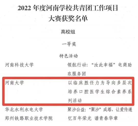 近日,口腔医学院“以临床胜任力为导向多层次培养口腔医学生综合素养系列活动”项目荣获2022年度“活力杯”河南学校共青团基层基础工作大赛一等奖。