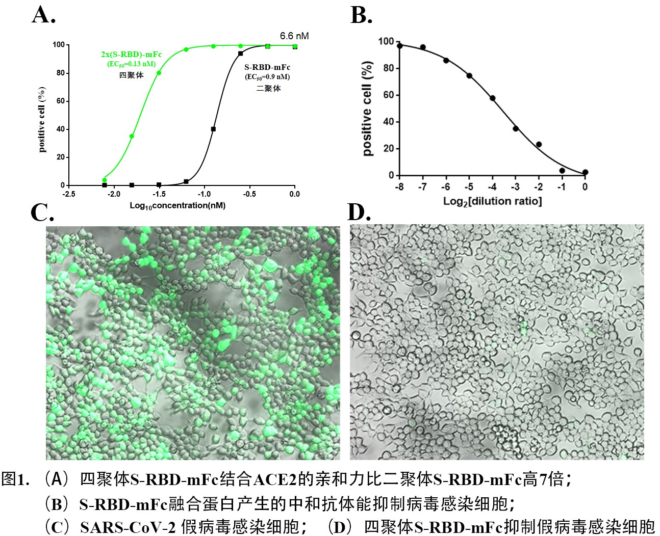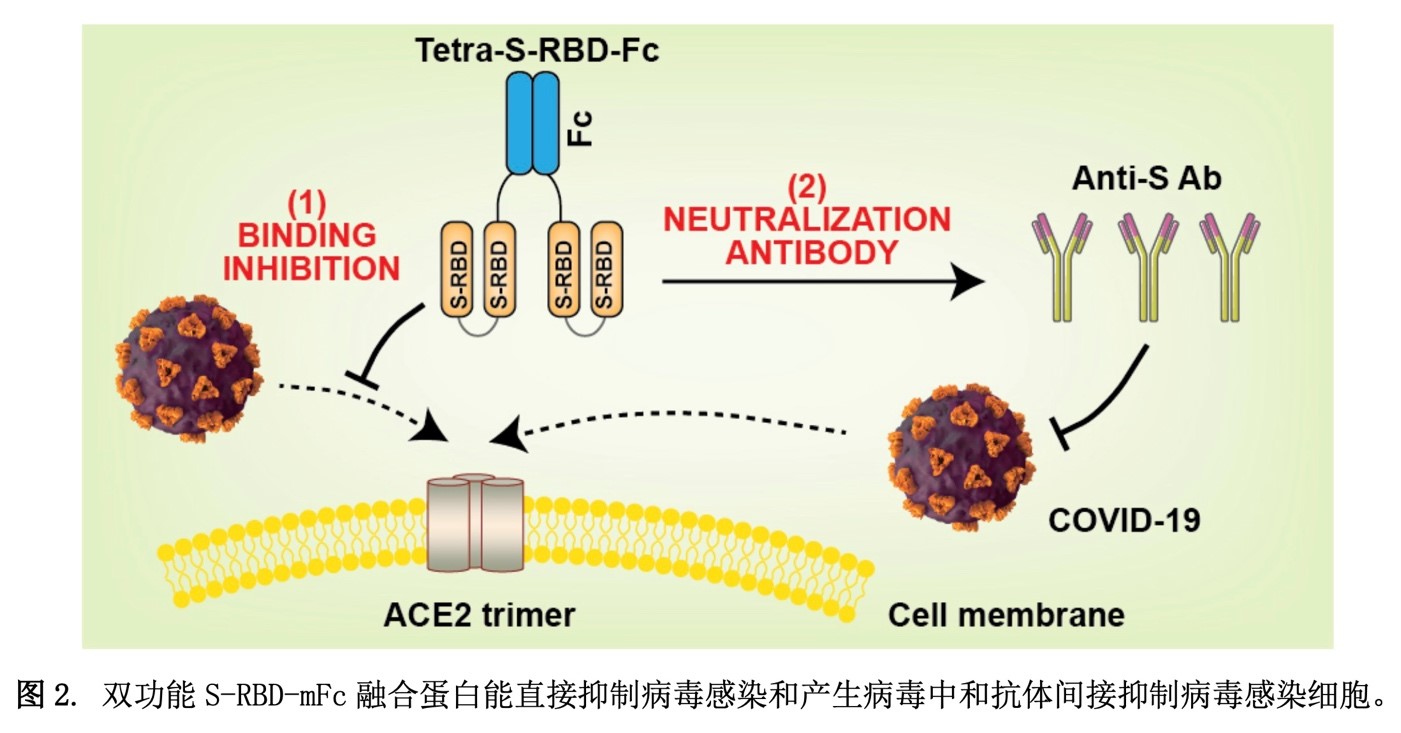 王彦明教授团队对COVID-19病毒触棘(S)蛋白的受体结合区域(RBD)进行研究,开发了具有自主知识产权的四聚体S-RBD-Fc抗体融合蛋白,建立了安全的假病毒感染HEK293T-hACE2细胞体外研究体系。研究发现,通过竞争抑制S-RBD和其细胞表面受体ACE2的结合,四聚体S-RBD-Fc抗体融合蛋白在0.13 nM浓度下能抑制50%的假病毒感染,抑制活性比二聚体S-RBD-Fc抗体融合蛋白高7倍。同时发现,抗体融合蛋白免疫小鼠后产生的S-RBD中和抗体能有效抑制假病毒的感染能力,并且对新出现的变种Omicron S蛋白假病毒具有抑制作用。抗体融合蛋白通过给药后能直接抑制病毒感染和后期产生中和抗体两个机制,实现“一石二鸟”的预防和治疗效果。四聚体S-RBD-Fc抗体融合蛋白具有更高的受体亲和力等技术优势,为应对现有新冠病毒及其新变种提供了一个潜在的周期短、灵活、有效的抗体融合蛋白研发方向。